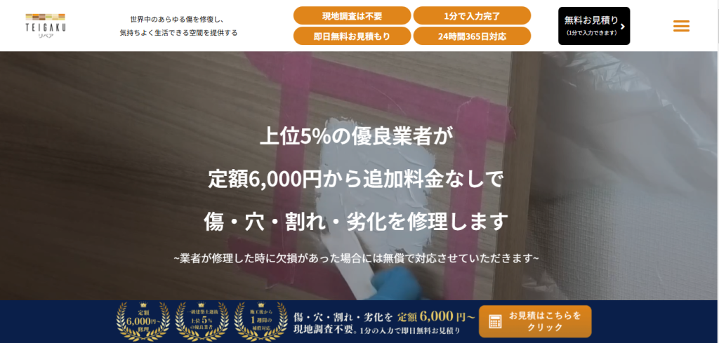定額リペア – フローリング、壁穴、扉穴等の補修をテイガク明瞭会計で。