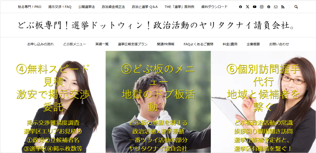 選挙ドットウィン!どぶ板実績No.1ポスター貼り掲示許可交渉代行業者 政治選挙専門 地域密着型ポスタリストによる、政治活動用ポスター・演説会告知ポスター・二連ポスター・個人ポスター・政党ポスター・政治団体(無所属含む)PR・商用ポスター広告等の、豊富なポスター掲示(貼付)交渉代行の実績No.1。 –