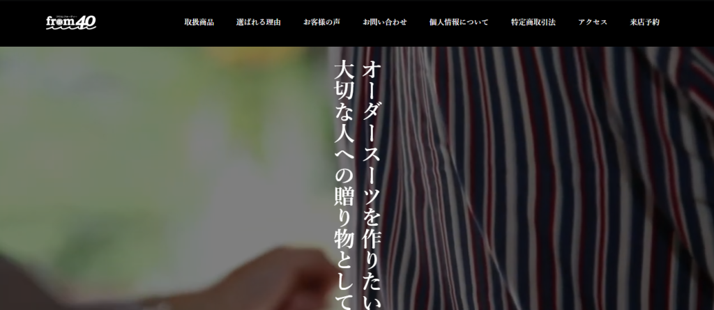 松江市のオーダースーツ・シャツ専門店をお探しならfrom40へ | オーダースーツ・オーダーシャツ専門店from40/フロム・フォーティーです。生地や縫製にこだわりお客様のご要望を具現化できるよう永くご愛用できる質の良い商品をご提案しております。パーターンオーダーシューズも承っております。このサイトが使用しているテーマはこちら